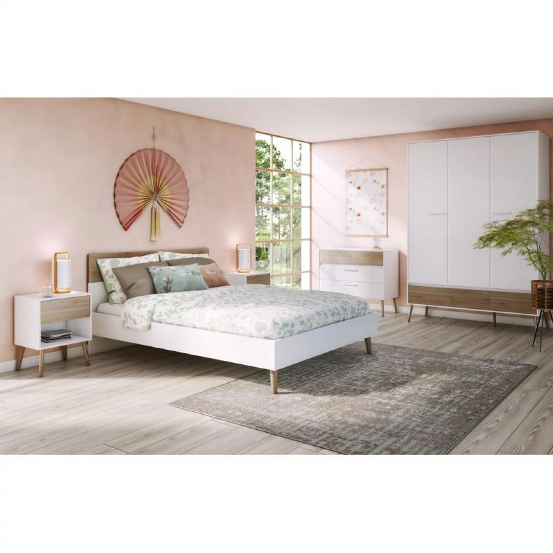Des pieds en chêne massifConçu pour une petite chambre de deux personnes et disponible en largeur 160 cm, ce lit 140 x 190 cm conviendra également à une personne seule qui souhaite disposer d’un large espace de couchage. Les pieds en chêne massif de ce lit blanc et imitation chêne, lui confèrent une excellente stabilité. Le matelas et le sommier sont vendus séparément, ce qui vous permet de choisir l’épaisseur, la densité et l’accueil qui favoriseront la qualité de votre sommeil. Complétez l’achat de ce lit avec les autres éléments de mobilier de la gamme ALBORG.Une ambiance zen dans la chambreLes panneaux de particules de ce lit ALBORG ont été revêtus de papier décor imitation chêne du Japon et blanc au niveau de la tête de lit. Il s’intégrera avec beaucoup de charme dans une ambiance d’inspiration zen ou scandinave, grâce à ses teintes claires et naturelles, ainsi qu’à à ses pieds obliques.