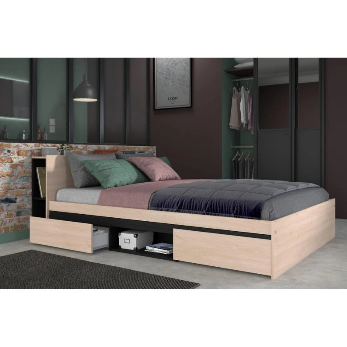 Points forts But Lit 140×190 cm avec 2 tiroirs et tête de lit avec rangements LODGE imitation chêne et noir