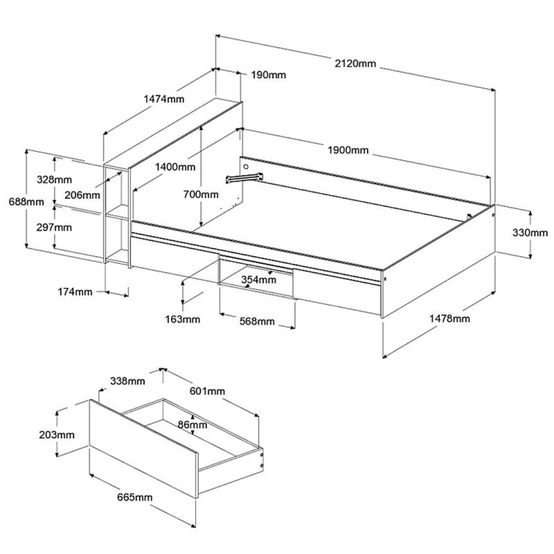 Pans :en panneaux de fibres de moyenne densité revêtus de papier décor imitation chêne et noir. . Teinte :imitation chêne et noir. . Côtés :2 tiroirs inclus. Montage des tiroirs et de la niche possible des 2 côtés. . Garantie :2 ans , Pièces. . Structure :en panneaux de particules revêtus de papier décor imitation chêne et noir. . Couchage en cm : Couchage 140×190 cm (sans matelas, sans sommier). . A monter soi-même. . Vendu sans matelas. . Vendu sans sommier. . Dimensions en cm :l. 147,8 – H. 70 – L. 212 cm. . Dispo pcs détachées donnée fournisseur :NC. .