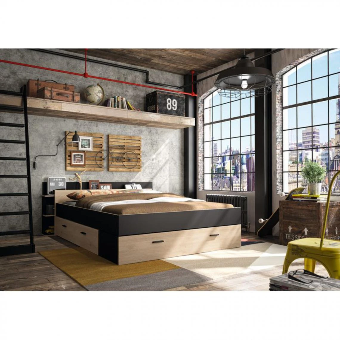 Un cadre et une tête de lit noirs, des tiroirs imitation châtaignier, ce lit 140 x 190 cm se caractérise par son cachet industriel. Ses lignes rigoureuses, soulignées par l’alternance des deux coloris, structurent le décor de la chambre et conviennent également à un cadre moderne.