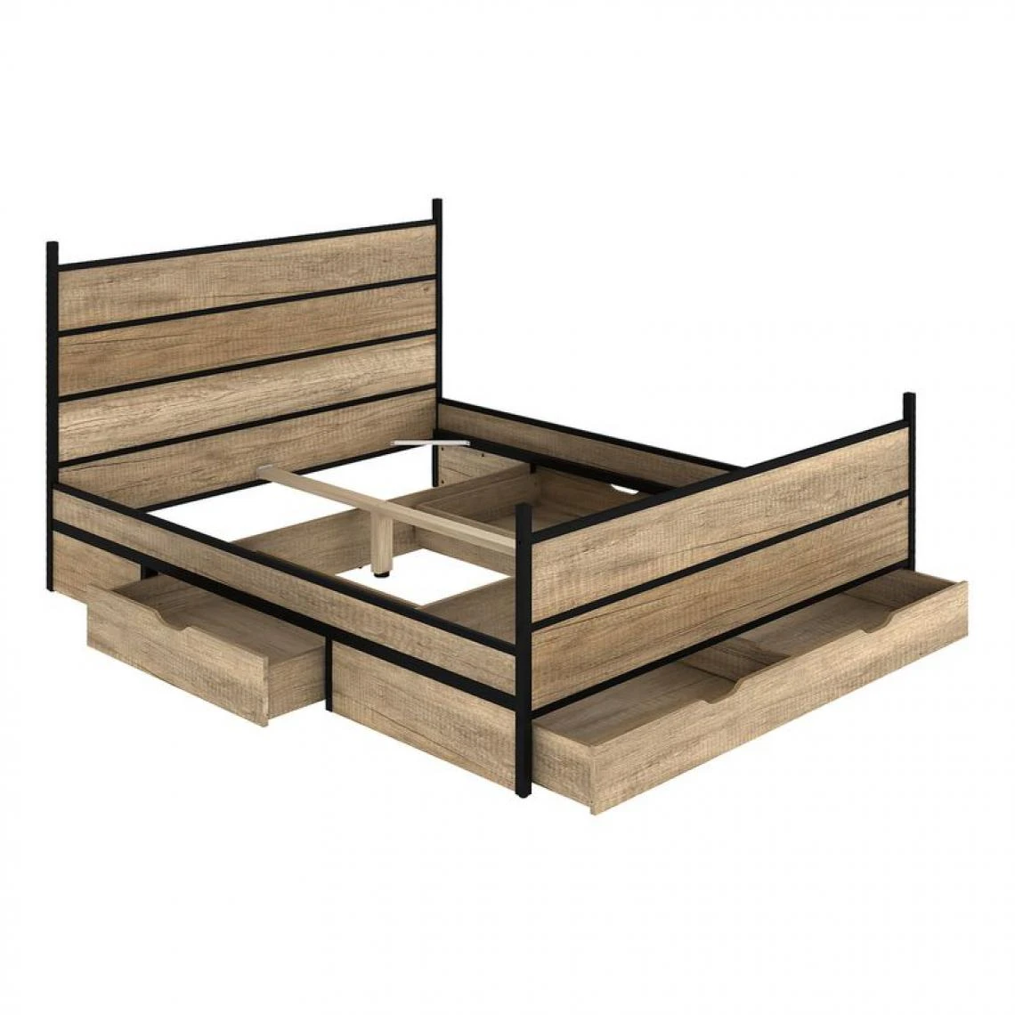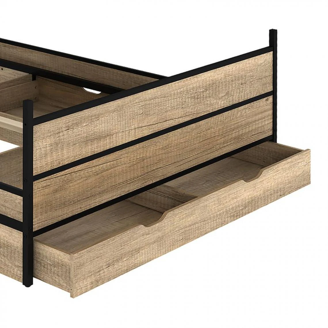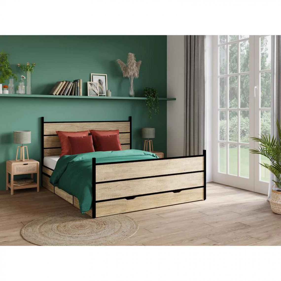 Des rangements pratiquesLe lit MAYDO est une option de choix pour les petites chambres. En effet, ce meuble gain de place dispose de trois tiroirs qui vous permettront de ranger différents accessoires discrètement. Deux petits tiroirs sont situés sur le côté et un grand tiroir occupe le pied de lit. Ce lit 160×200 cm convient parfaitement pour deux adultes. Comme il est vendu sans sommier ni matelas, vous pouvez réutiliser la literie que vous possédez déjà. Réalisé en panneaux de particules, ce lit se dépoussière facilement avec un chiffon doux. Le piètement en métal recouvert d’époxy assure une excellente robustesse et ajoute une petite touche déco.Un style industrielCe lit imitation chêne et noir reprend l’alliance de matériaux typique du design industriel. Vous pouvez l’associer facilement avec d’autres meubles façon chêne aux montants en métal pour obtenir une décoration coordonnée. Ses teintes douces permettent de créer un espace reposant et propice au sommeil.