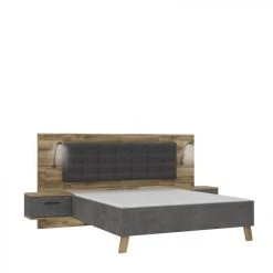 Teinte :en imitation chêne, optique béton gris foncé et polyuréthane. . Sommier :support en métal à hauteur réglable. . Garantie :2 ans, pièces. . Structure :en panneaux de particules et en panneaux de fibre de moyenne densité,avec chants ABS, revêtu de papier décor. . Pied de lit :en bois massif (peut avoir des nuances de couleur). . Tête de lit :coussinage x86 en polyuréthane anthracite. . Quincaillerie :en acier. . Couchage en cm :160×200 cm (sans matelas, sans sommier). . A monter soi-même. . Vendu sans matelas. . Vendu sans sommier. . Dimensions en cm : l. 266,5 – H. 120 – L. 209,9 cm. . Dispo pcs détachées donnée fournisseur :2 ans. .