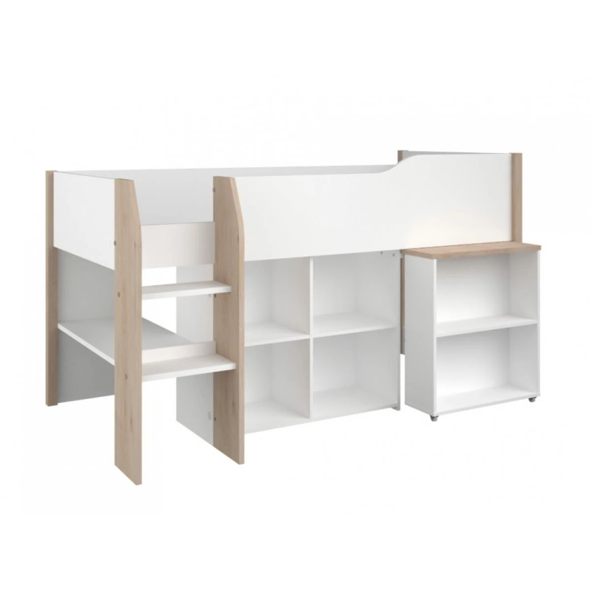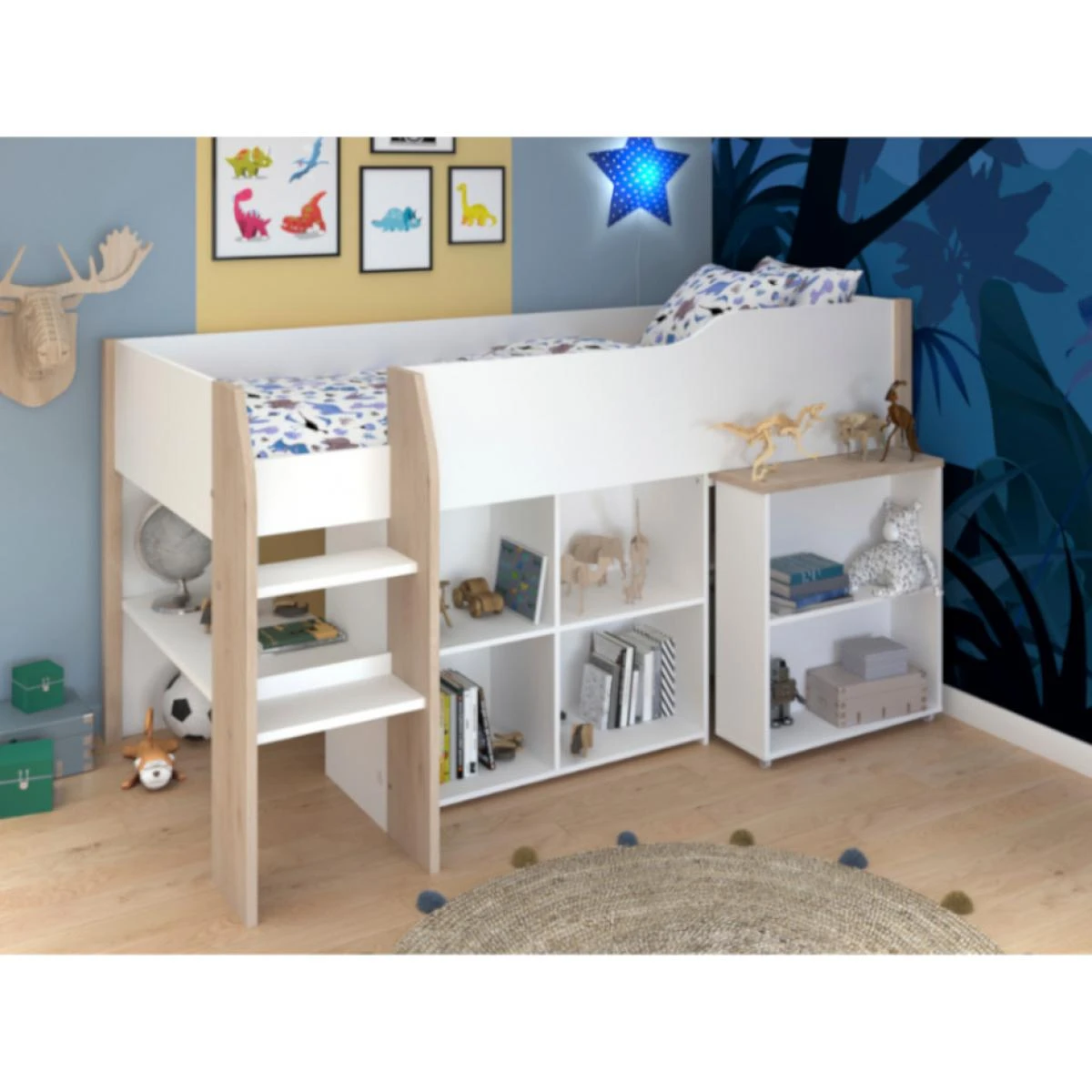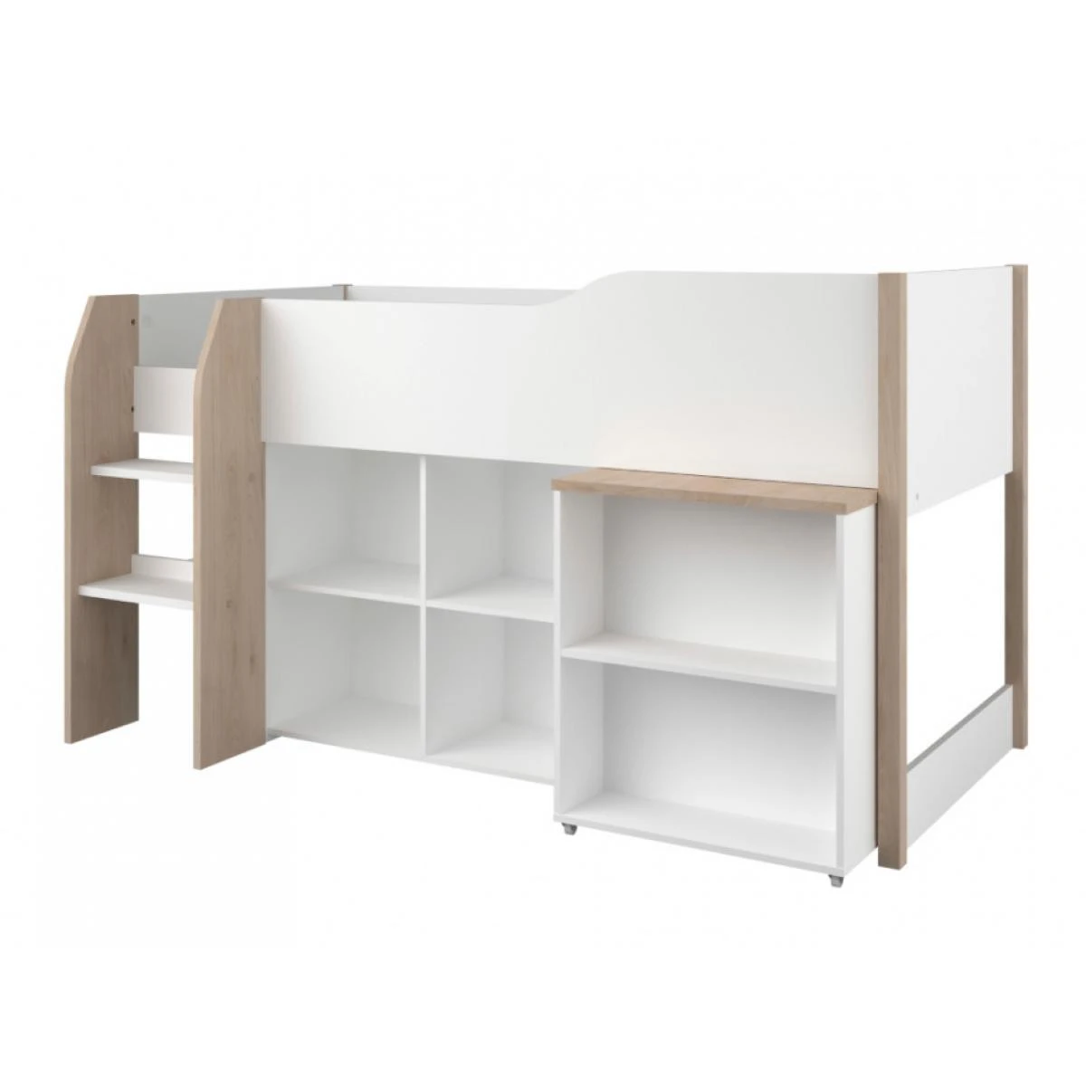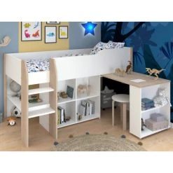 Sommier :Sommier panneau décor blanc inclus . Finition :papier décor blanc et chêne jackson . Garantie :2 ans, pièces . Structure :Structure en panneaux de particules de 15, 18 et 22 cm . Couchage en cm :90×200 cm – poids maximum supporté : 80 kg . Vendu sans matelasVendu sans matelas, épaisseur maximum préconisée : 15 cm . Vendu sans sommierVendu avec sommier . Dimensions en cm :L208 x H118 x l183 cm . A monter soi-même :Oui . Dispo pcs détachées donnée fournisseur :0 an . Le couchage en hauteur ne convient pas à des enfants de moins de six ans6 ans minimum .