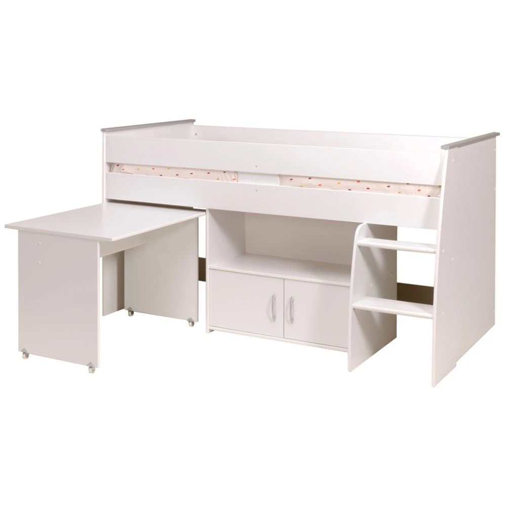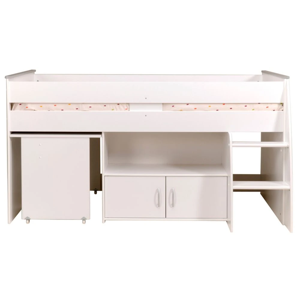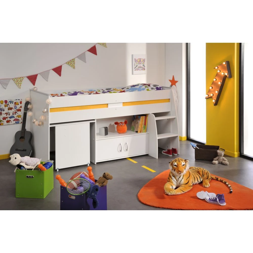 Teinte :Blanc . Sommier :Sommier en panneau inclus . Garantie :2 ans, Pièces. . Structure :Panneaux de particules revêtus de papier décor blanc . Couchage en cm :90×200 cm . Vendu sans matelasVendu sans matelas . Vendu sans sommierVendu avec sommier en panneau . Dimensions en cm :L206,4xH110xP113,7 cm . A monter soi-même :Oui. . Conforme aux normes en vigueur. . Dispo pcs détachées donnée fournisseur :Zéro an . Le couchage en hauteur ne convient pas à des enfants de moins de six ans. .