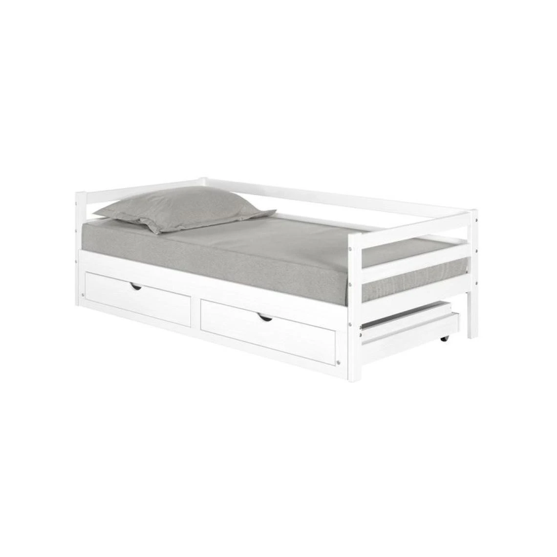 Convertible en couchage 2 personnes.. 2 tiroirs de rangement intégrés.. Bois massif. Existe en gris..