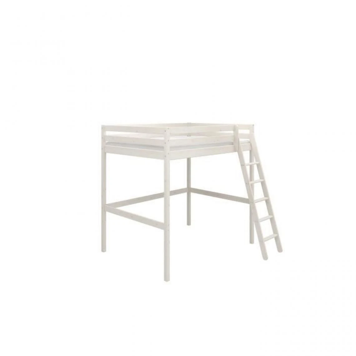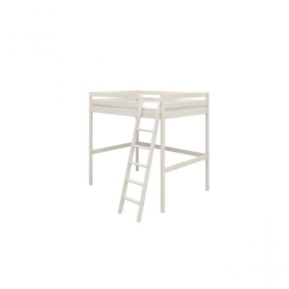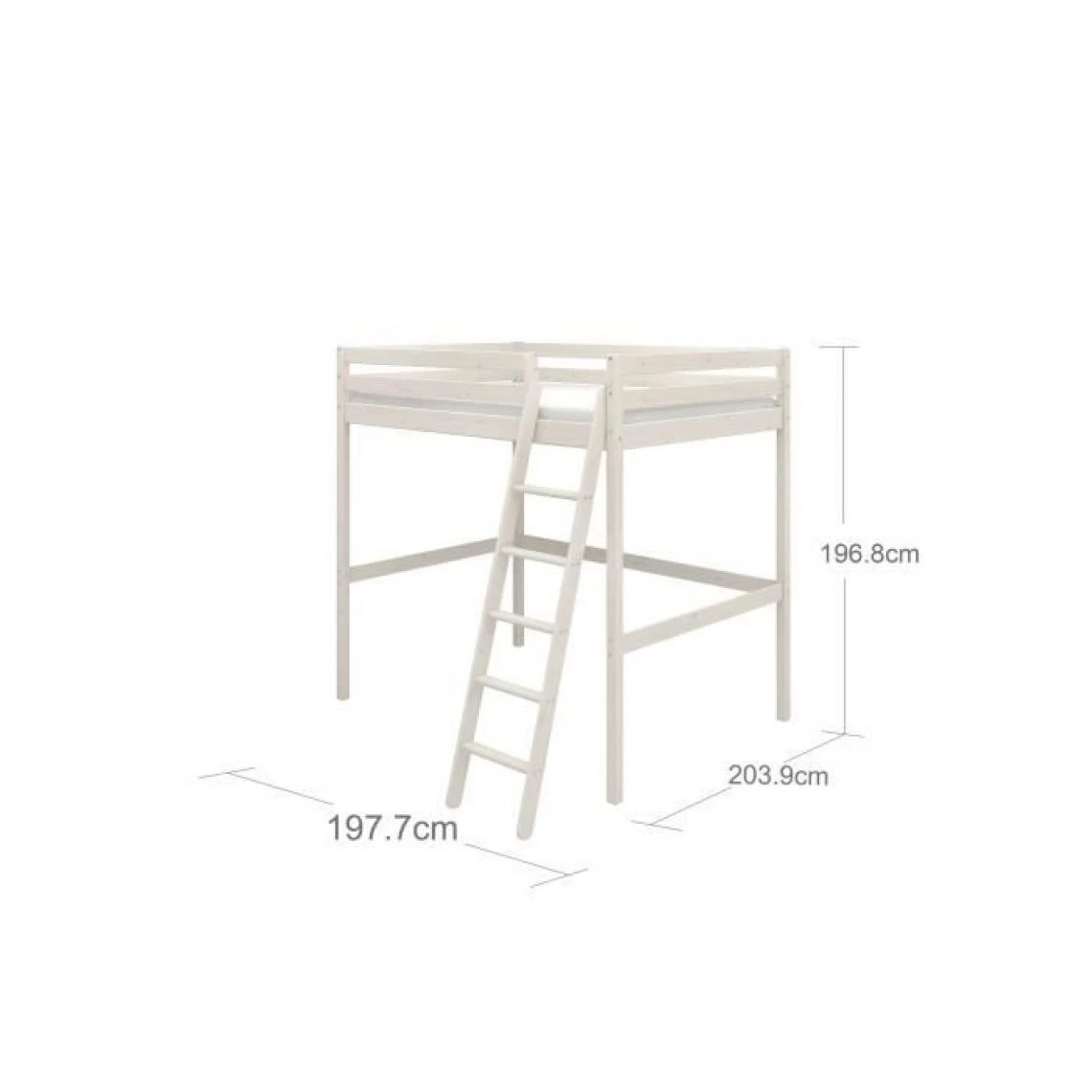 ERIKA Lit mezzanine enfant – Structure en bois Pin massif – Coloris : Blanchie – Montage échelle réversible a gauche ou a droite – Couchage : 140 x 190 cm – Sommiers inclus – Livré sans matelas – Dimensions totales : L197.7 x P203.9 x H196.8 cm – Le couchage en hauteur ne convient pas aux enfants de moins de 6 ans.