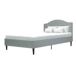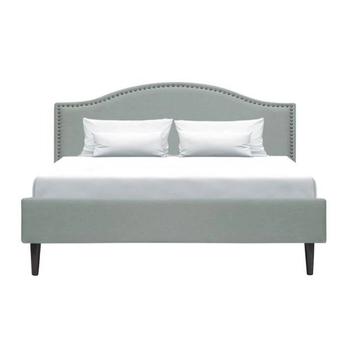 lit adulte classique – tissu gris clair – tête de lit arrondie et cloutée – pieds en bois – sommier inclus – l 160xl 200 cm.