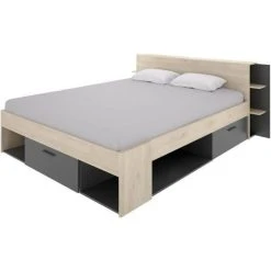 Lit adulte SAX pour couchage 140×190 composé d’une tête de lit avec de multiple rangement, 3 tiroirs et 2 niches sous le lit – Structure en panneaux de particules mélaminés- Coloris : chêne et gris anthracite – livré sans sommier ni matelas – Dimensions totales L216 x l 180 x H85 cm.