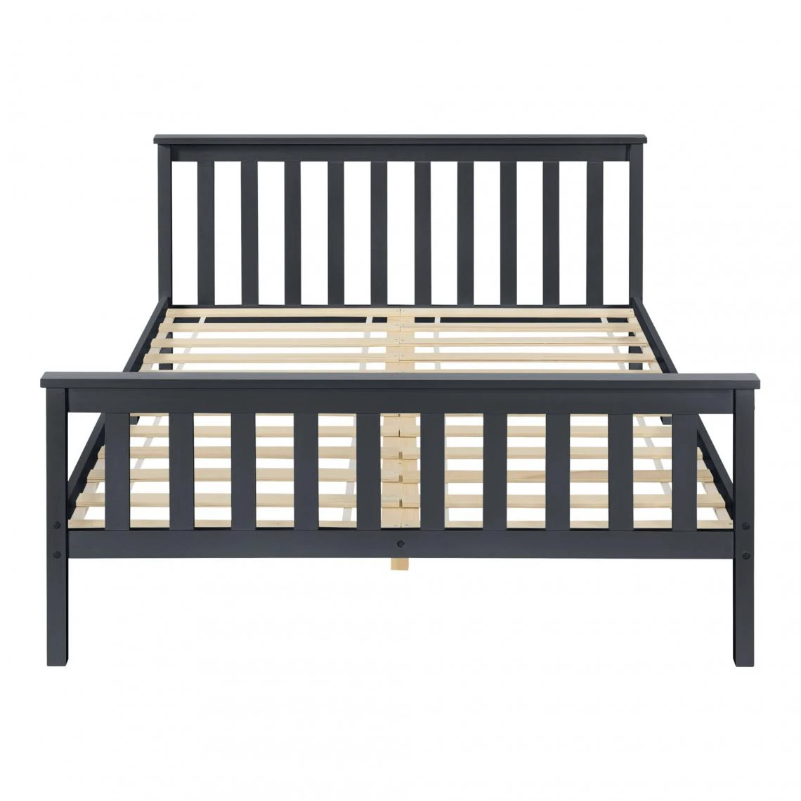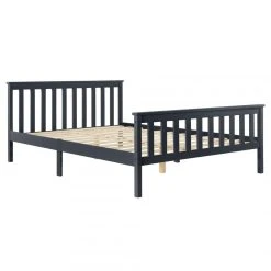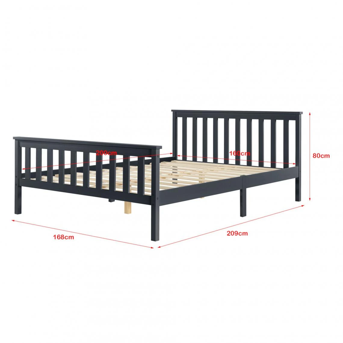 Cadre de lit en bois de pin Ce lit en pin avec la tête élevée pourra devenir l’ornement de n’importe quelle chambre. : – cadre de lit en bois de pin – la tête de lit élevée augemente le confort – montage simple Dimensions : – totales (longueur x largeur x hauteur) : 209 x 168 x 80 cm – surface de couchage (longueur x largeur) : 200 x 160 cm – hauteur de la tête de lit (mesurant du sommier) : 52 cm – distance entre le sol et le dessus du pied de lit : 60 cm – hauteur du cadre : 30 cm Capacité de charge : jusqu’à 200 kg Matière : cadre : pin lattes : bois stratifié Couleur : gris foncé mat laqué Contenu de la livraison : 1 x cadre de lit 1 x sommier à lattes standard A noter : le matelas, les oreillers, la couverture et les autres objets de décoration ne font pas partie de l’offre.