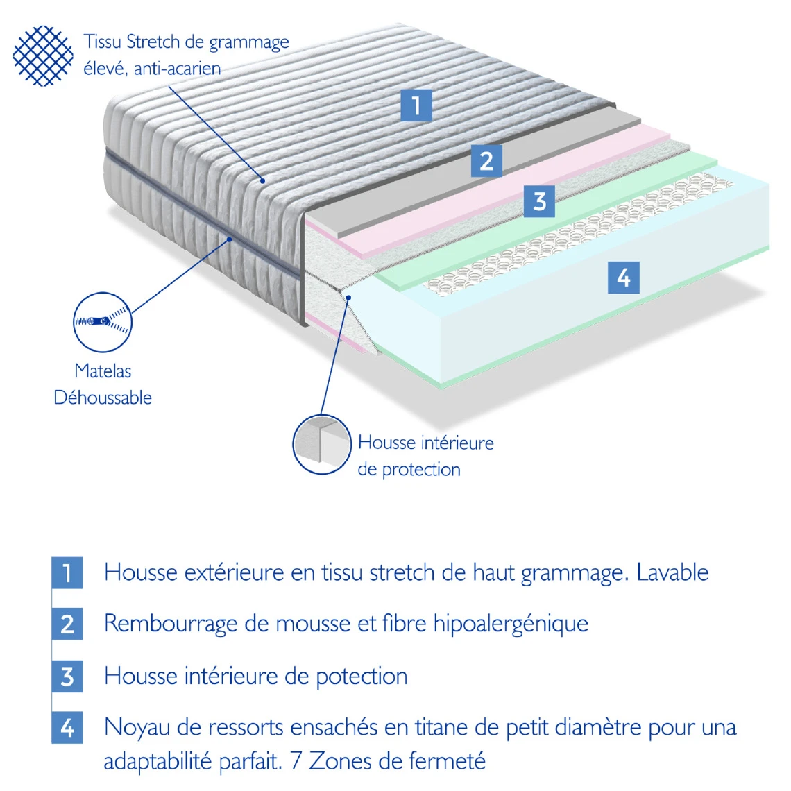 •Matelas déhoussable. Il a deux housses. La housse extérieure est faite de tissu Stretch de grammage élevé et de haute qualité. Cette housse extérieure est rembourrée avec des mousses de dernière génération super soft et des fibres hypoallergénique. En outre, il dispose d’une housse intérieure en tissu de protection multi-élastique qui facilite le retrait de la housse.