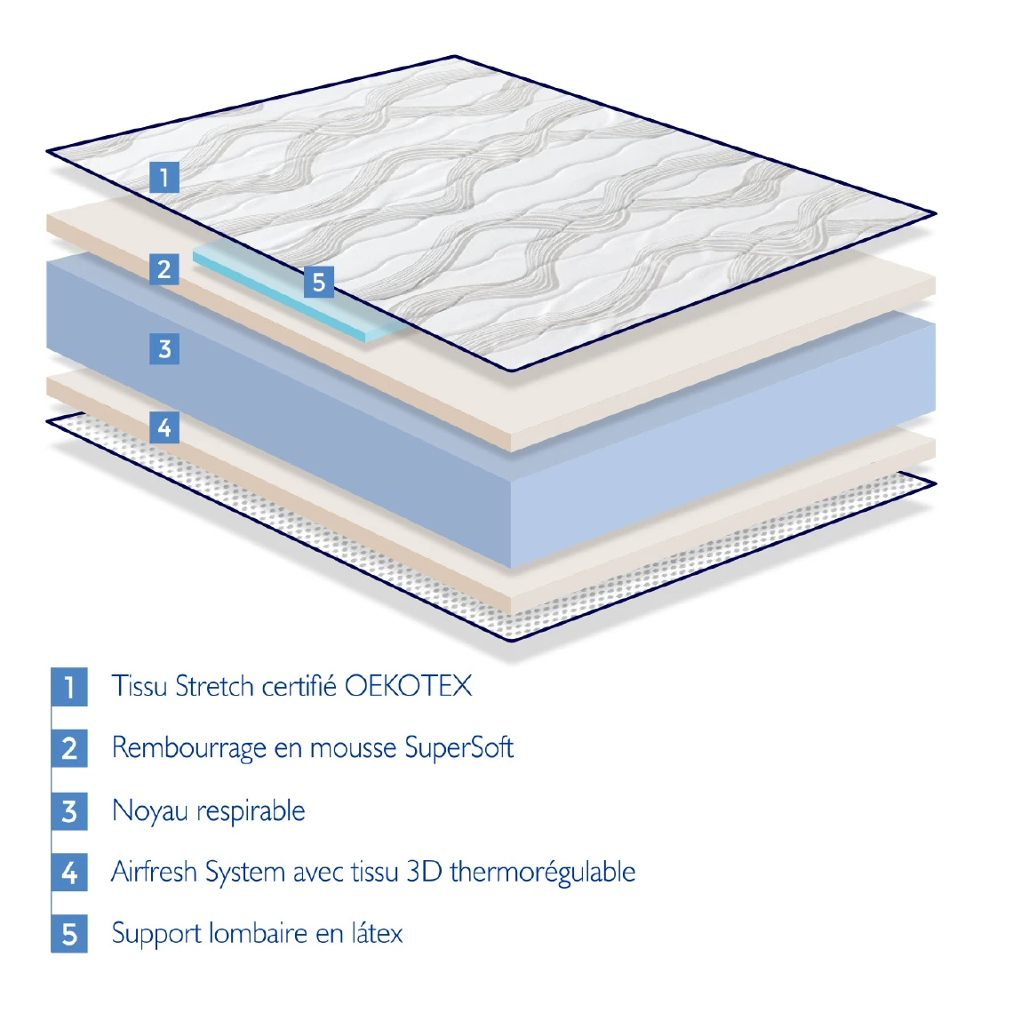 •Noyau: Dureté douce. Il est formé d’un pore plus ouvert que les autres matelas de cette gamme pour favoriser la ventilation et ainsi empêcher l’humidité