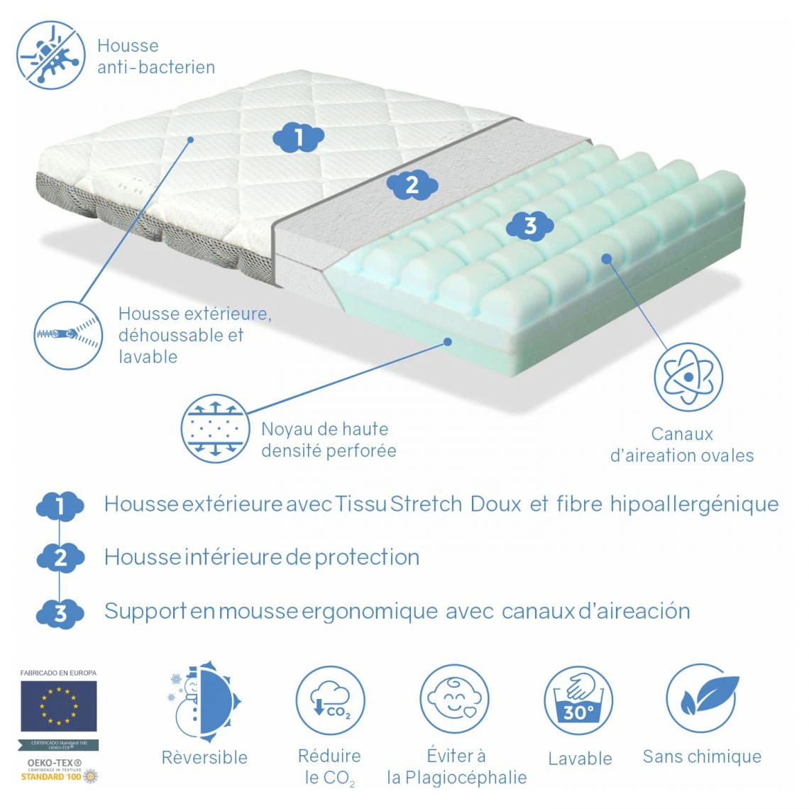 Noyau Mousse de dernière génération avec canaux d’aération qui garantit une bonne ventilation en éliminant la chaleur et l’humidité. Elle est d’une densité suffisante pour s’adapter au corps du bébé et pour éliminer les zones de pression en réduisant l’agitation nocturne. Prévient le risque de plagiocéphalie. Il dispose d’un cadre périphérique haute densité qui maintient le bébé au centre du matelas en l’empêchant de se coincer entre les barreaux du berceau. Réduire le CO2 Canaux d’aération.