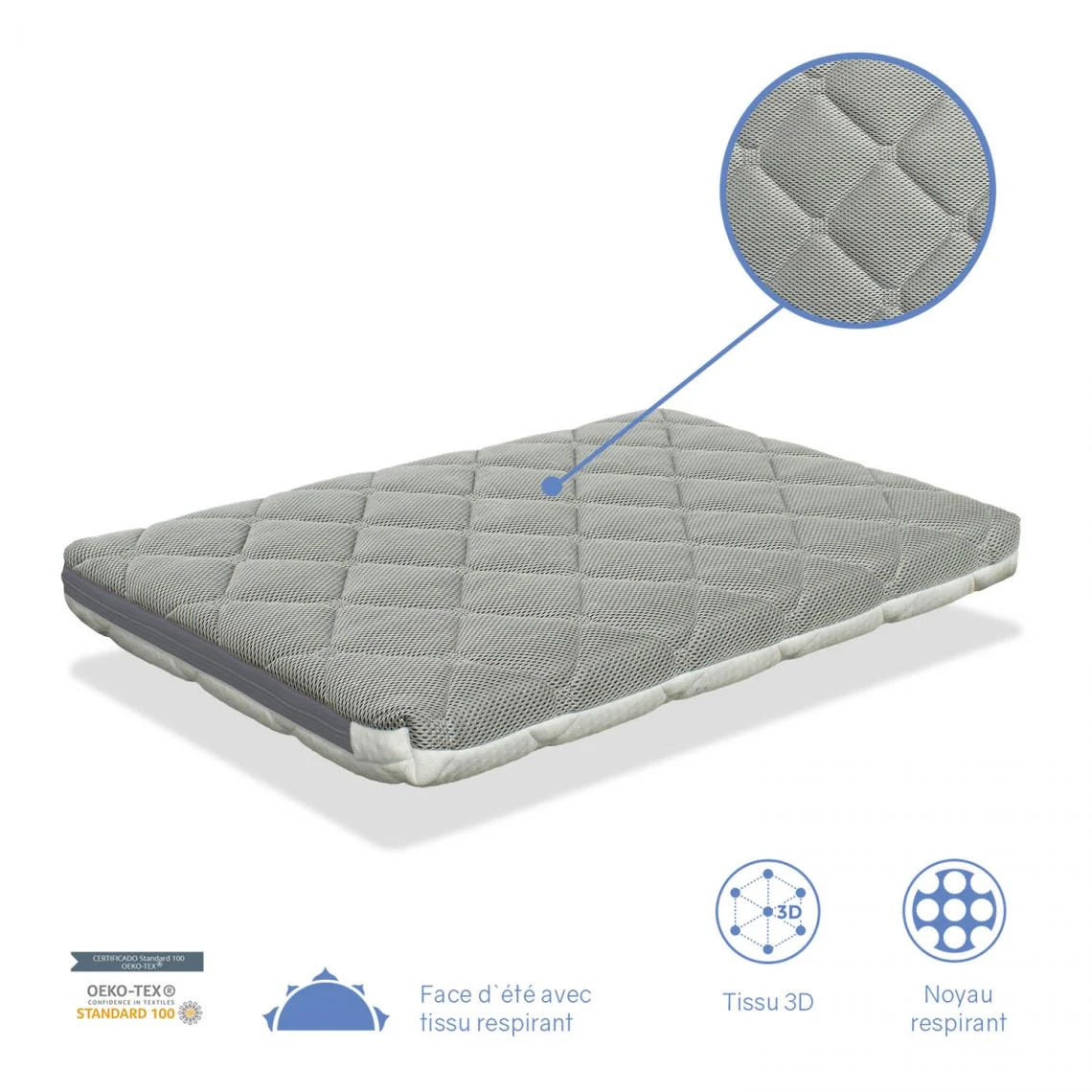 Tissu 3D déhoussable lavable (30ª) Dimensions Ce matelas a une hauteur de 7 cm. Il pèse 1,8 kg et est fabriqué avec des composants sûrs et non nocifs pour la santé de notre bébé.