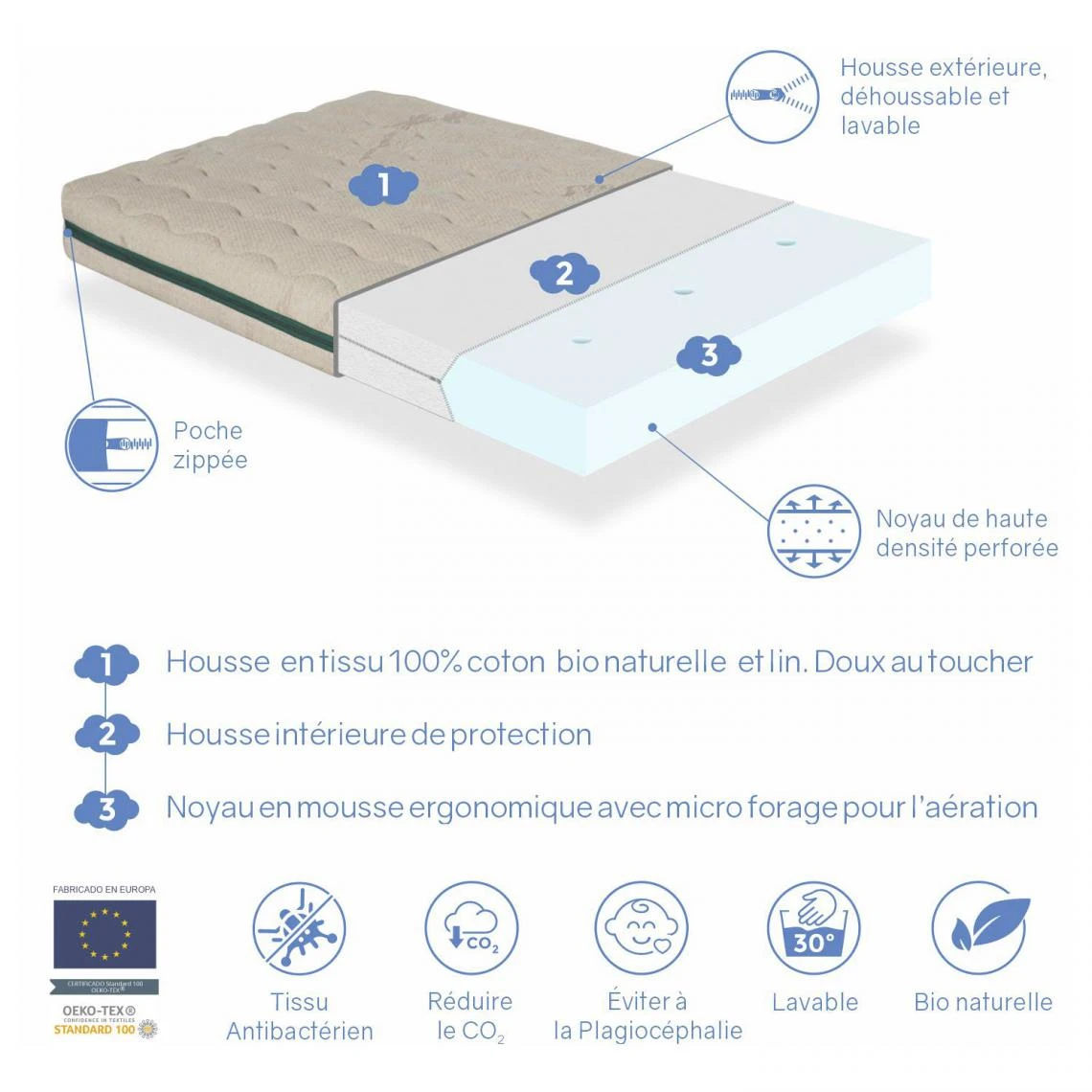 La housse extérieure est en tissu 100% BIO composé de coton et de lin. Doux au toucher Il est rembourré de fibre anti-acarien qui combat naturellement la prolifération des allergies et aide à protéger le repos de bébé. Respirant, confortable et facile à laver. Il dispose également d’une housse intérieure en tissu de protection multi-élastique pour faciliter le retrait et protéger la mousse.