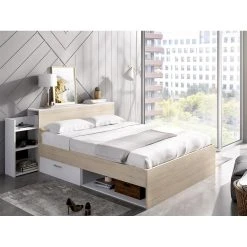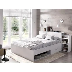 Vente-unique Lit Avec Tête De Lit Rangements Et Tiroirs 140x190cm – Coloris : Blan…