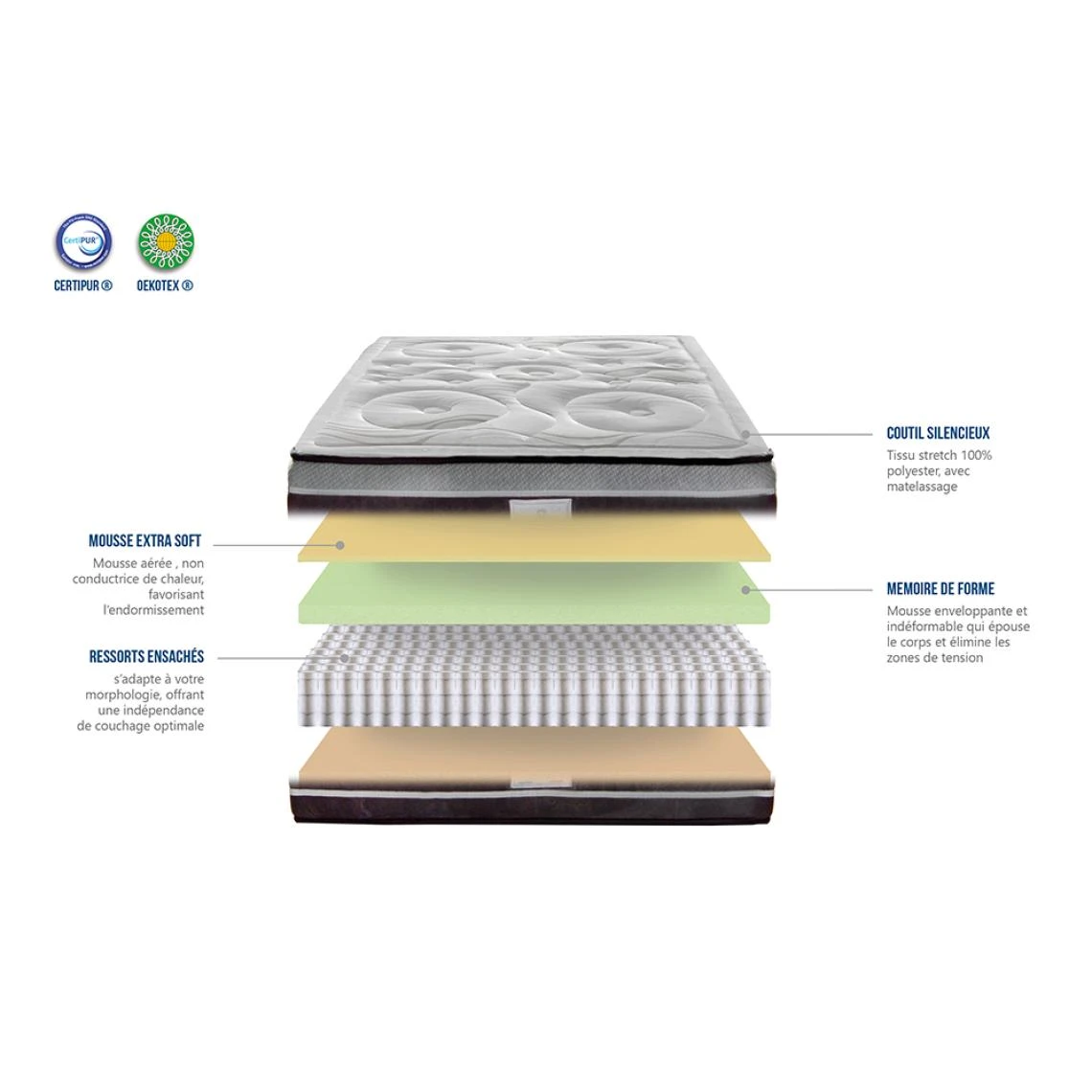 Découvrez le meilleur du confort avec la literie haut-de-gamme Hypsom. La marque française associe l’innovation à la tradition afin de vous offrir un sommeil de qualité et le luxe de dormir aussi bien chez vous que dans un palace ! Le matelas Divin, d’une qualité hôtelière digne d’un 5 étoiles, offre un sommeil d’exception. Composé de ressorts ensachés et de mousse à mémoire de forme, il apporte à l’utilisateur un confort optimal. En effet, ses 858 ressorts ensachés assurent un excellent soutien du corps et la mousse à mémoire de forme une belle ergonomie. Ces deux technologies confèrent également au matelas une très bonne indépendance de couchage : les mouvements sont absorbés et les nuits de sommeil ainsi nettement améliorées.