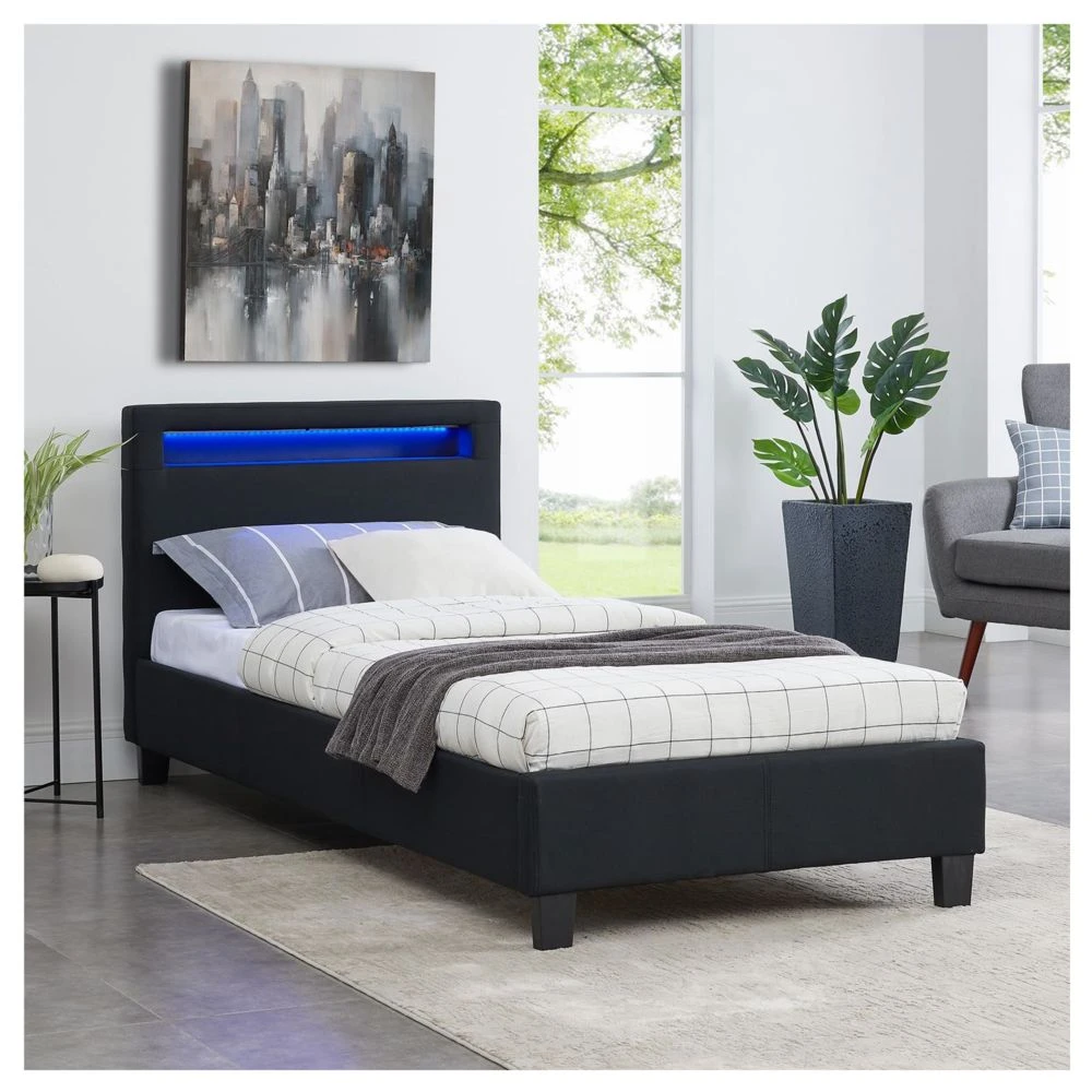 Points forts Idimex Lit simple pour adulte ou enfant MOLINA avec sommier 90×190 cm 1 place 1 personne, tête de lit avec LED intégrées, en tissu noir