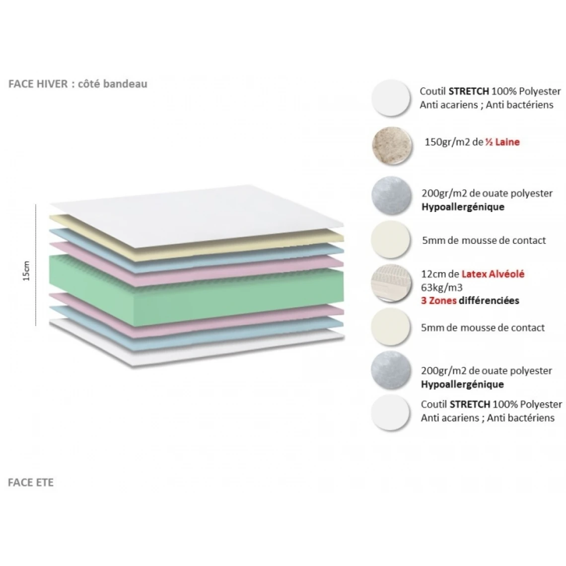 Ame : 2 cm de mousse à mémoire de forme HD50/m et 12 cm de mousse Haute Résilience 35kg/m3 (une des meilleurs du marché car durable, souple et ferme à la fois)