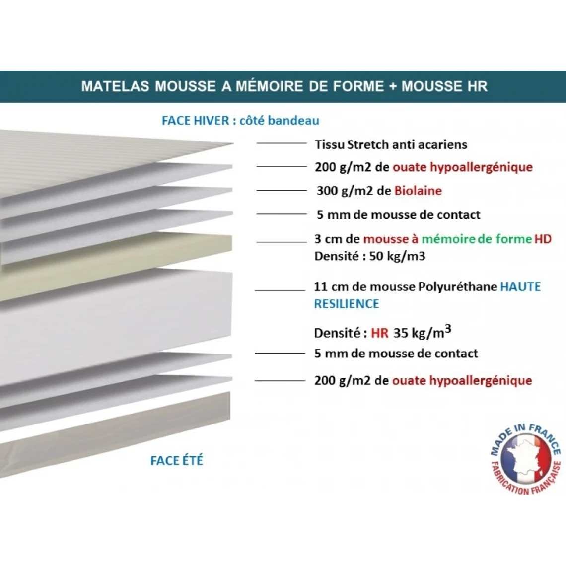 Ame : 2 cm de mousse à mémoire de forme HD50/m et 12 cm de mousse Haute Résilience 35kg/m3 (une des meilleurs du marché car durable, souple et ferme à la fois)