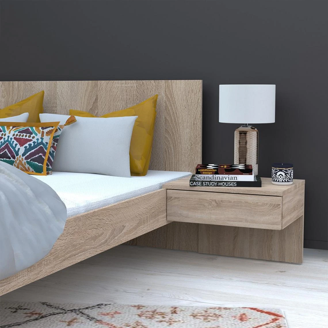 Le lit COOL allie modernité et praticité avec ses deux chevets suspendus intégrés à la structure de lit. Astucieux, les chevets suspendus ne prennent pas de place au sol et possède chacun un tiroir. Son revêtement en décor chêne blanchi s’adapte aux décorations modernes et permet d’apporter une ambiance scandinave et naturelle à la chambre.