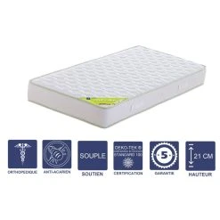 MATELAS Nuits d’or :· Accueil : Ferme .· Soutien : Souple .· Technologie matelas : Mousse Aertech+ Très Haute Densité HR 35 Kg/m3 Dernière Génération· Épaisseur du matelas : +/- 21 cm.· REPOS PLUS SAIN grâce au Traitement Anti-acariens / anti-bactérien / Anti-moisissures.· Indépendance de couchage. · DORMEZ TRANQUILLE avec la Garantie 5 ans – 5 Zones différenciées de Confort .TISSU :· Coutil stretch matelassé de 290 gr/m2 de Polyester avec traitement Sanitized. Tissu avec + Alèse NATUREL pour une très bonne évacuation de l’humidité et un toucher Doux et Soyeux· SANITIZED : Traitement antibactérien et anti-moisissures diminuant également le développement des odeurs.STRUCTURE ET GARNISSAGE :· Plateau supérieur : coutil en tissu stretch matelassé avec 1,5 cm de mousse profilée à Haute Ventilation pour Maximiser le Confort· Plateau inférieur : coutil en tissu 3D pour la bonne Respiration du noyau matelassé Air System.· Tissu Hyper Respirant réalisé en 3 dimensions qui permet une circulation libre de l’air offrant ainsi une plus grande ventilation et d’HYGIENE .· Plate-bande: Tissu Hyper RESPIRANT matelassé avec de la ouate polyester et des poignées cousues à la main.· Âme noyau : bloc de 18 cm de Mousse HAUTE RESILIENCE Aertech+ Très Haute Densité HR 35 Kg/m3 dernière génération Indéformable· Passepoil de renfort· TISSUS CERTIFIES : Système de Qualité Certifié Oeko-tex 100 , Certipur testé contre les substances nocives. Certification ISO 9001PROTEGE MATELAS· Imperméable Hygiénique – Ajustable pour Matelas de 13 à 35 cm de Hauteur – Absorbant et Respirant – Barrière anti-Acariens – Dessus 35% coton 65 % Polyester – Dessous en Péva : matière souple et écologique – Il prolongera la durée de vie de votre matelas