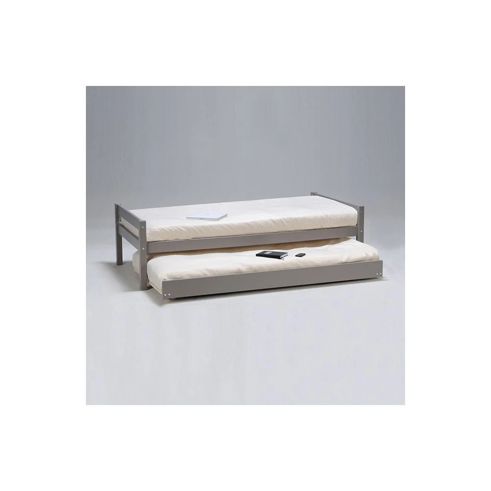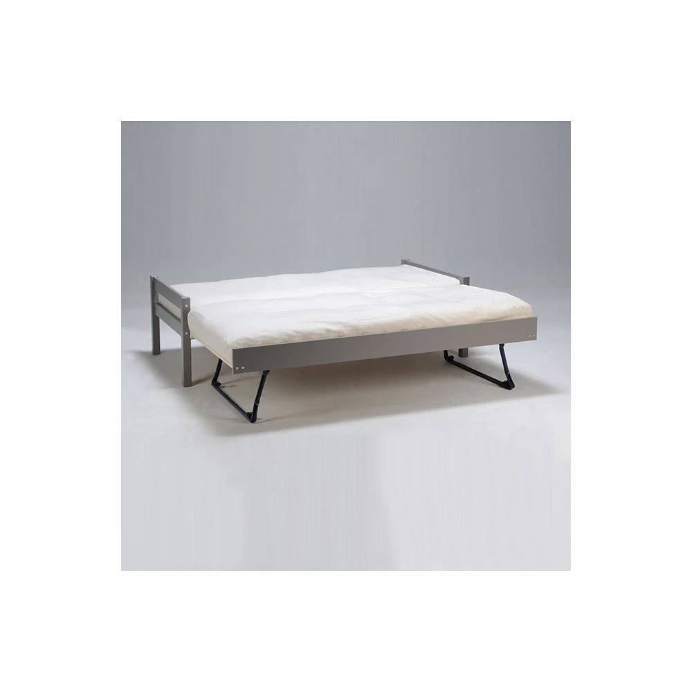 Lit gigogne JUSTIN 90 x 200 cm Structure en sapin massif Tiroir monté sur roulettes, pieds métalliques escamotables Finition : Laqué gris Hauteur maximale matelas conseillée : 18 cm Livré démonté, avec 2 sommiers à lattes