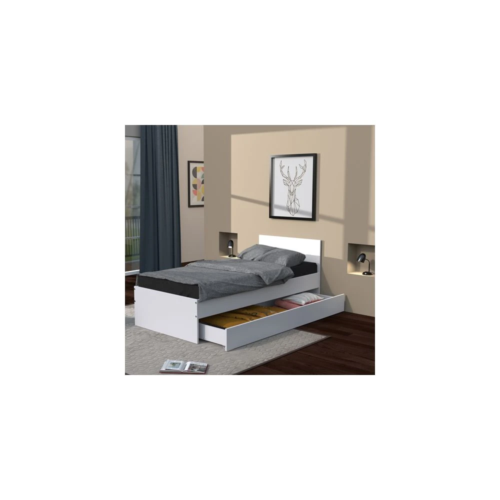 Lit simple OSLO 90 x 190 cm Structure en panneau de particules Finition : blanc Tiroir monté sur roulettes Livré démonté, sans sommier ni accessoires