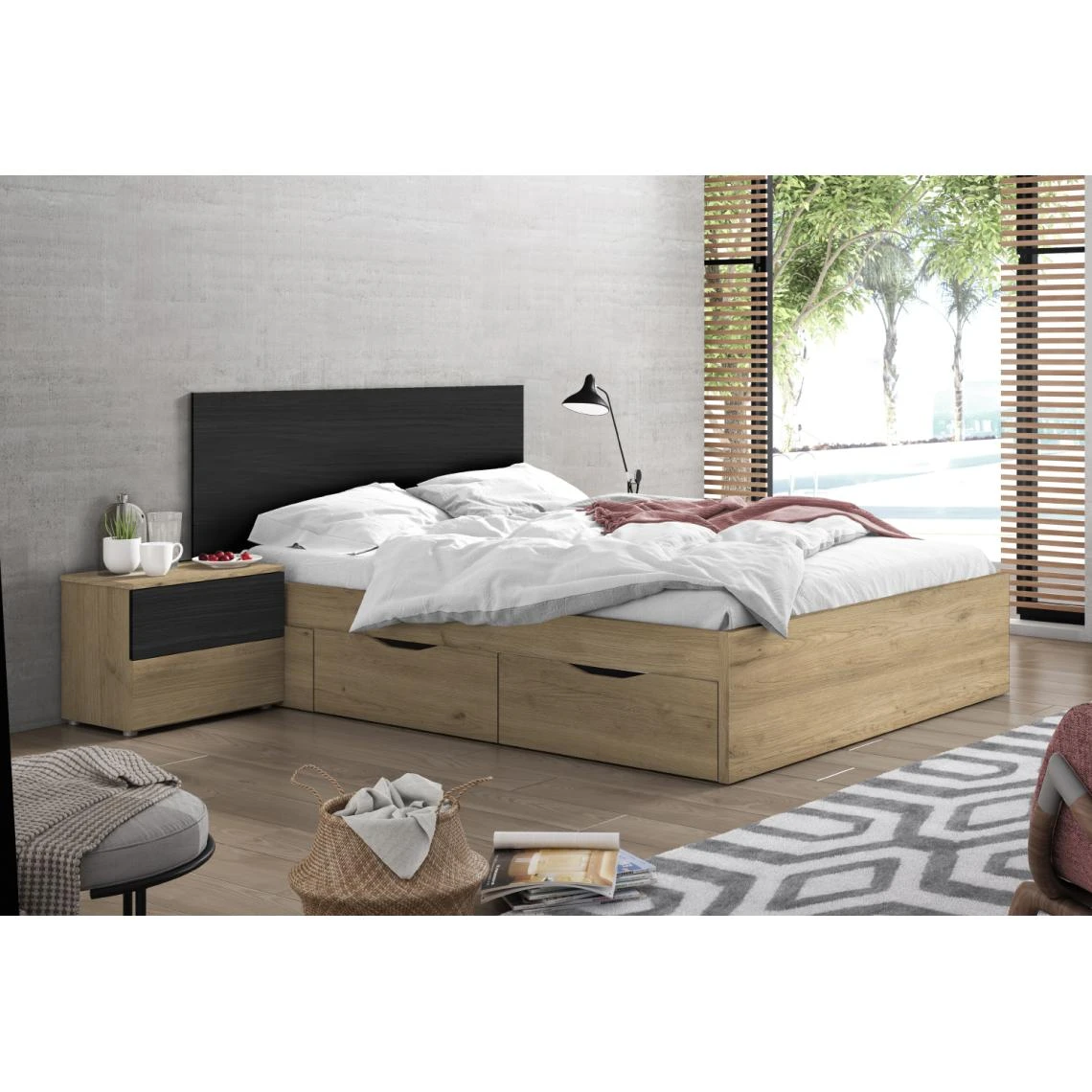 Lit adulte avec tiroirs en mélamine coloris naturel, noir; facile à installer dans votre chambre. Livré sans sommier ni matelas.