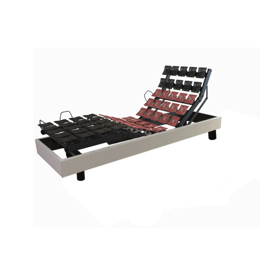 – Sommier électrique Excellence finition tissu:- Cadre: Mobile en multiplis de hêtre recouvert papier décor section 50 x 20 mm.- Fonctionnalité dos reculant: diminution de la compression abdominale.- Caisse droite: recouverte tissu bleu velours, radar sable, chiné brun foncé, tissé gris, simili blanc, simili cuir beige, simili gris foncé, jepp taupe.- Palpeurs (plots): Mémoire de forme sur l’intégralité du couchage + réglables de la fermeté 3 positions (Souple/Medium/Ferme) sur zones sensibles épaules et assise.- Moteur: 2x 4500N avec > intégré: Système de protection et de contrôle du champ électromagnétique + fonction relais en cas de coupure de courant avec pile de 9V.- Télécommande: télécommande filaire soft touch, TOPLINE.- Accessoires : 4 pieds de lit hauteur 15 cm + 2 pieds de raccord + butées d’arrêt de matelas.- Garantie: 5 ans sur la structure + moteur + télécommande filaire.Tête de lit, télécommande sans fil et matelas vendus séparément. Choisissez votre colorisbleu_veloursradar_sablechine_brun_foncetisse_grissimili_blancsimili_cuir_beigesimili_gris_foncejepp_taupe