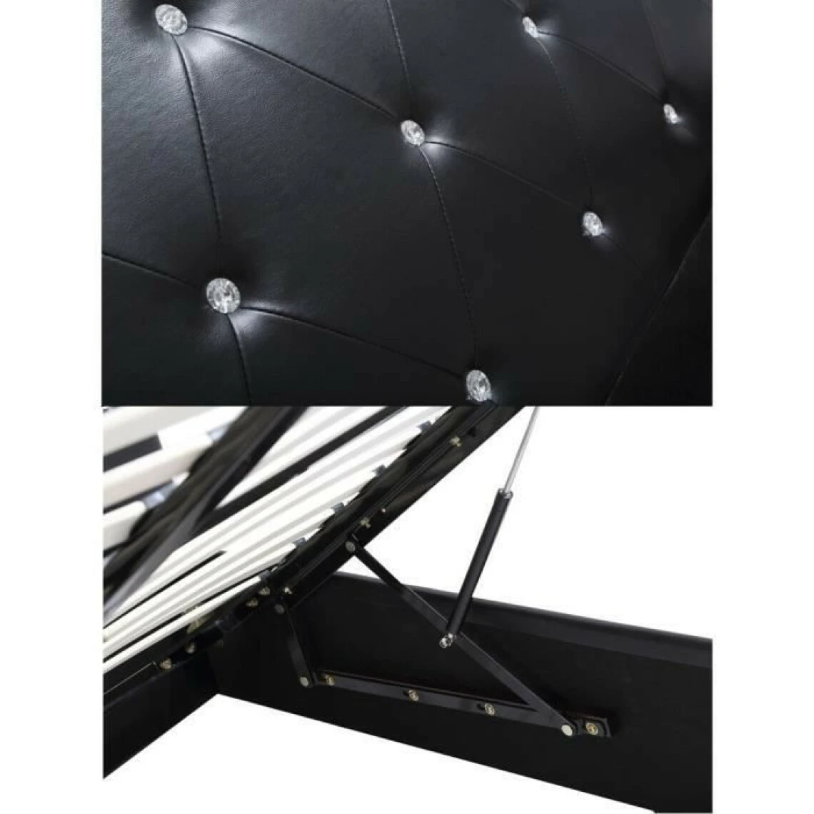 BAHIA Lit adulte l 140 x L 190 cm – En bois et panneaux de particules, revetement PVC noir – Style et design contemporain – Tete de lit capitonnée de strass brillantes – Coffre de rangement sous lit – Sommier avec vérins de relevage du sommier ultra simple – Dimensions article monté : l 149 x L 206 x H 89 cm.