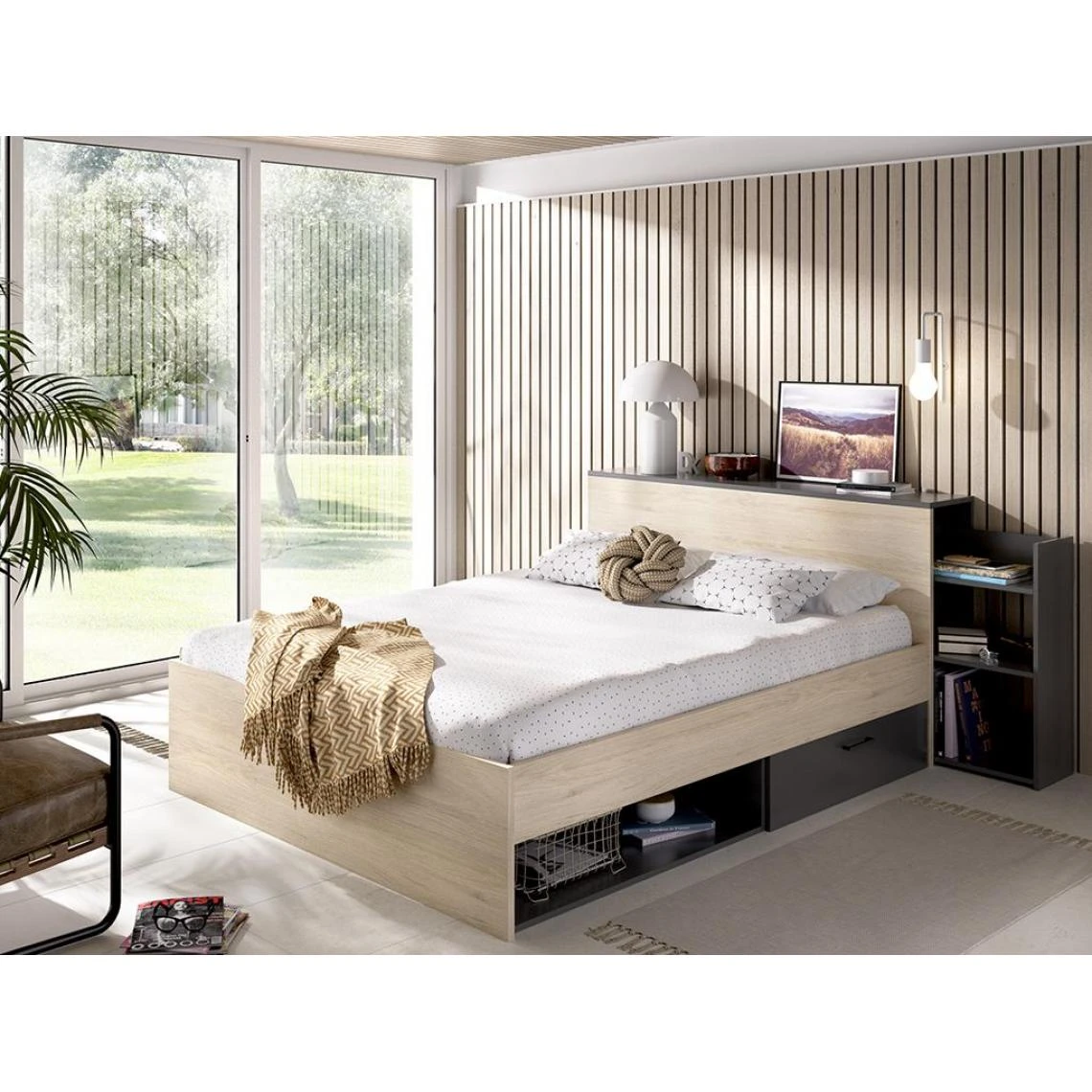 Points forts Vente-Unique Lit avec tête de lit rangements et tiroirs 140 x 190 cm – Coloris : Naturel et anthracite – FLORIAN